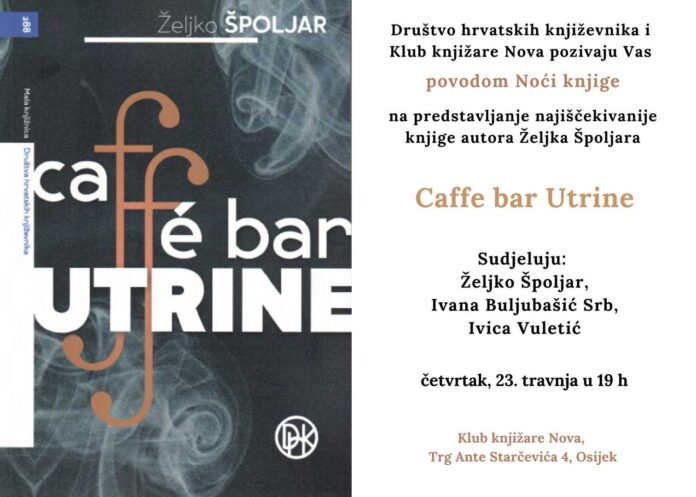 U sklopu nacionalne manifestacije Noć knjige, u Osijeku će u četvrtak, 23. travnja, biti predstavljena nova knjiga autora Željka Špoljara „Caffe bar Utrine“.