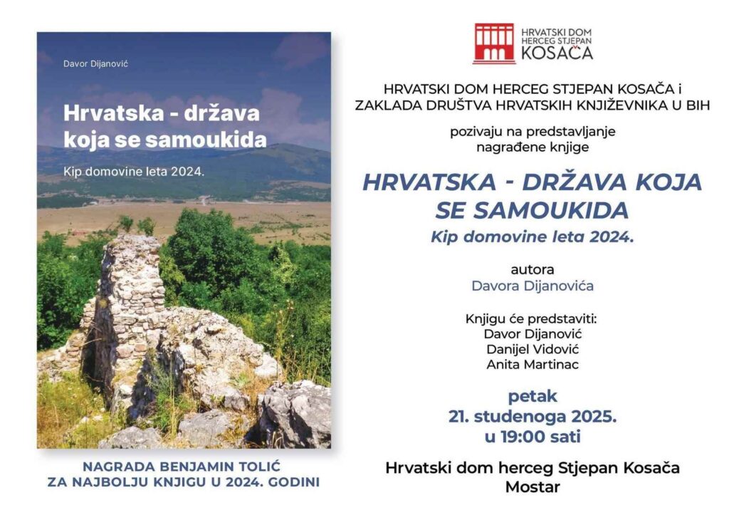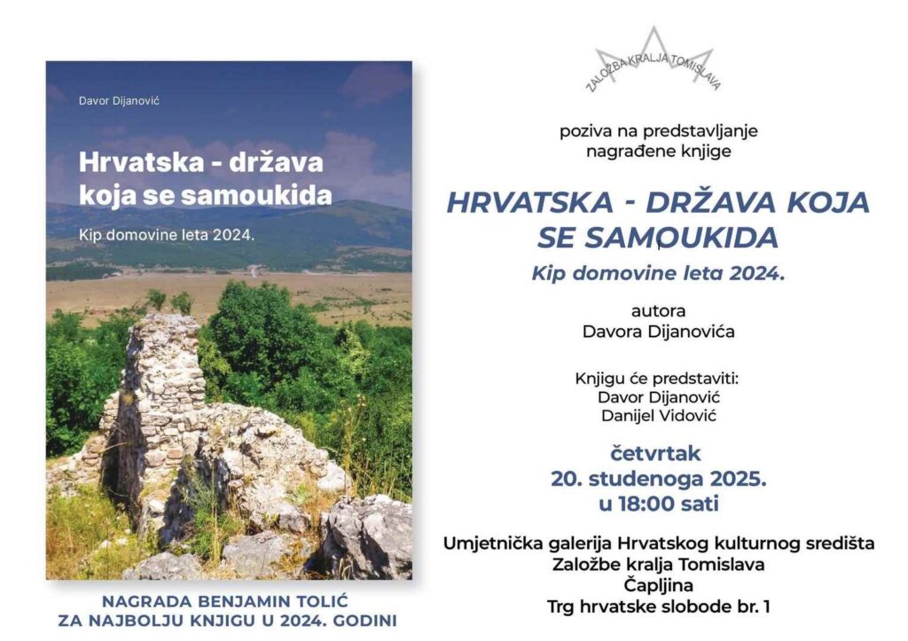 U organizaciji hrvatskih kulturnih i književnih institucija u Širokom Brijegu, Čapljini i Mostaru održat će se predstavljanje najnovije knjige publicista i novinara Davora Dijanovića „Hrvatska: država koja se samoukida“. Riječ je o djelu koje donosi analitički, dokumentiran i argumentiran prikaz ključnih političkih, društvenih i demografskih procesa koji oblikuju hrvatsku stvarnost, uz naglašenu kritiku strukturalnih slabosti i političko-kulturnih devijacija koje ugrožavaju dugoročnu stabilnost i identitet hrvatske države.