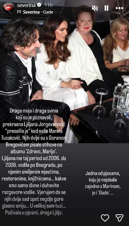 U svojoj poruci Severina je napisala da se Ljiljana, kako je kazala, “preselila kod naše Marine Tucaković”, podsjećajući na to da su upravo njih dvije, zajedno s Goranom Bregovićem, stvarale stihove za album Zdravo Marijo. Taj kreativni period bio je intenzivan i stvaralački bogat, a Severina je posebno istaknula vrijeme provedeno u Beogradu, gdje ju je Ljiljana vodila na mjesta koja su joj bila draga – u restorane, knjižnice i prostore koje je voljela.