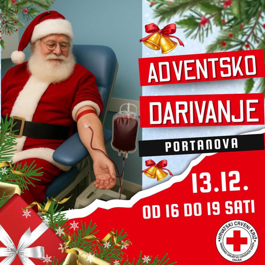 Dan poslije, u subotu, 13. prosinca 2025. godine, održat će se i 3. adventska akcija darivanja krvi u Trgovačkom centru Portanova (2. kat), i to od 16 do 19 sati. Adventsko darivanje već tradicionalno okuplja velik broj darivatelja, a blagdanske dekoracije i prigodna atmosfera dodatno naglašavaju simboliku činjenja dobra u danima koji slijede.