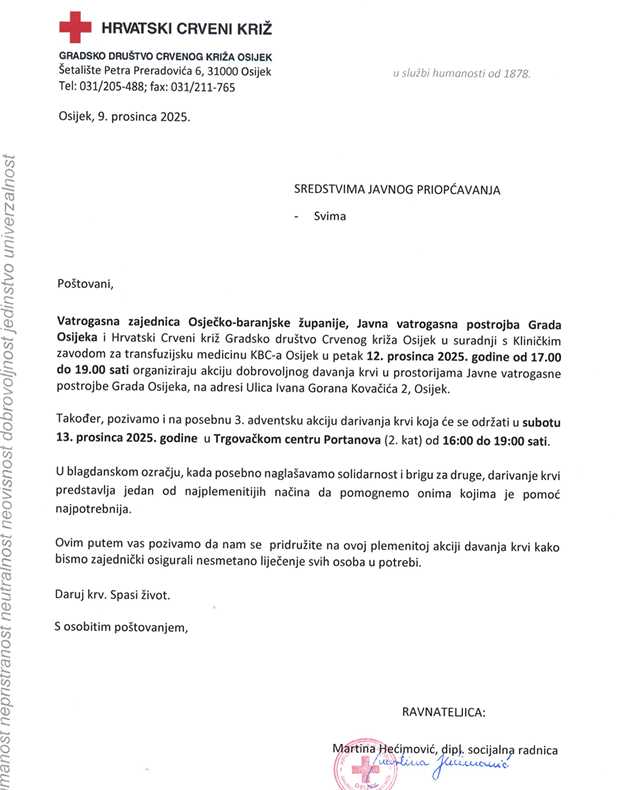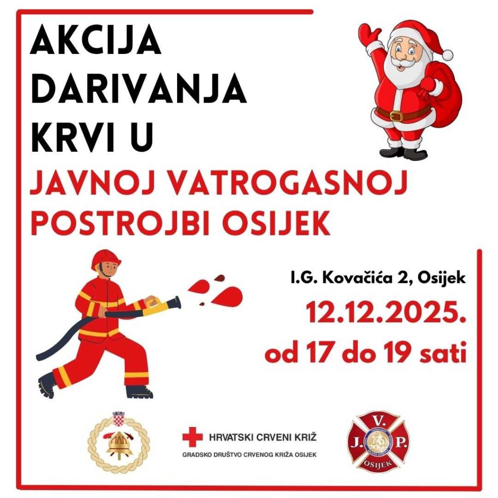 U predblagdanskom vremenu, kada se posebno naglašava važnost zajedništva i brige za bližnjeu Osijeku će biti održane dvije humanitarne akcije dobrovoljnog darivanja krvi koje zajednički organiziraju Vatrogasna zajednica Osječko-baranjske županije, Javna vatrogasna postrojba Grada Osijeka, Gradsko društvo Crvenog križa Osijek i Klinički zavod za transfuzijsku medicinu KBC-a Osijek.