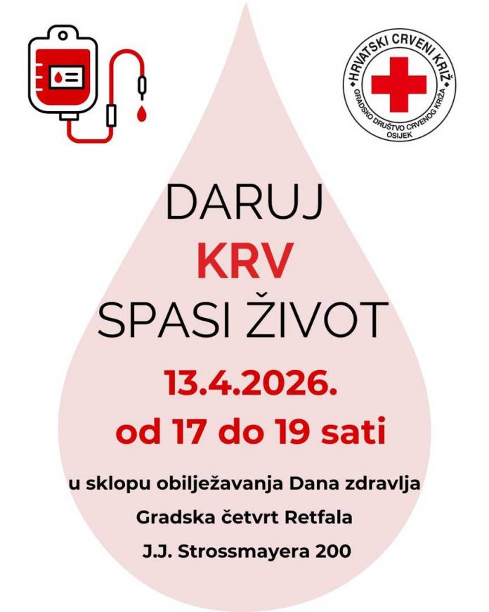 U Osijeku se u ponedjeljak, 13. travnja, organizira akcija dobrovoljnog darivanja krvi, a građani će krv moći darovati od 17 do 19 sati u Gradskoj četvrti Retfala.