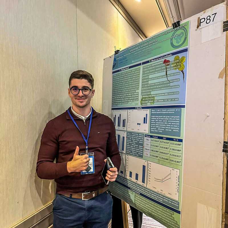 Posebno zapažen nastup imali su mladi istraživači s Odjela za biologiju u Osijeku. Gabrijel Mirković biolog iz Osijeka predstavio je poster u sklopu sekcije posvećene ekotoksikologiji i molekularnoj fiziologiji biljaka. Njegovo istraživanje usmjereno je na integriranu ekotoksikološku procjenu smjesa bisfenolnih analoga (BPA, BPS, BPF, BPAF), kemikalija koje se sve češće pojavljuju u okolišu kao posljedica industrijske i potrošačke upotrebe. Korištenjem modelnog makrofita Spirodela polyrhiza analizirani su morfometrijski, fotosintetski i biokemijski biomarkeri, s posebnim naglaskom na oksidativni stres i antioksidativne enzime. Rezultati su pokazali da okolišno relevantne koncentracije mogu izazvati hormetički odgovor i blago potaknuti rast, dok visoke koncentracije smjese dovode do ozbiljnog poremećaja redoks homeostaze, oštećenja tkiva i pada fotosintetske učinkovitosti. Time je još jednom potvrđeno da bisfenolni analozi, premda često promovirani kao sigurnije zamjene za BPA, mogu predstavljati ozbiljan rizik za vodene ekosustave.