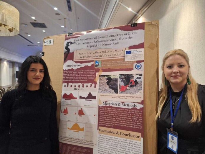 Velik interes izazvao je i nastup Sabine Alić, studentice druge godine diplomskog studija Zaštita prirode i okoliša, koja je predstavila svoj prvoautorski rad pod nazivom First Assessment of Blood Biomarkers in Great Cormorants (Phalacrocorax carbo) from the Kopački Rit Nature Park. Istraživanje donosi prvi sustavni pregled aktivnosti enzimskih i neenzimskih biomarkera u krvi ptića velikog vranca u Hrvatskoj te predstavlja važan doprinos razumijevanju izloženosti ptica okolišnim zagađivalima. U istraživačkom timu sudjelovali su i studenti Rocco Nekić i drugi članovi Odjela za biologiju, uz stručno vodstvo doc. dr. sc. Alme Mikuške, prof. dr. sc. Mirne Velki i doc. dr. sc. Dore Bjedov. Istraživanje je provedeno u suradnji s Hrvatskim društvom za zaštitu ptica i prirode tijekom prstenovanja 2025. godine.