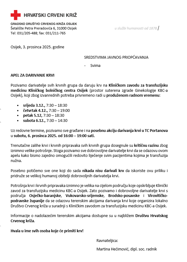 Hrvatski Crveni križ uputio je poziv darivateljima svih krvnih grupa da se odazovu. Njihov apel prenosimo u cijelosti.