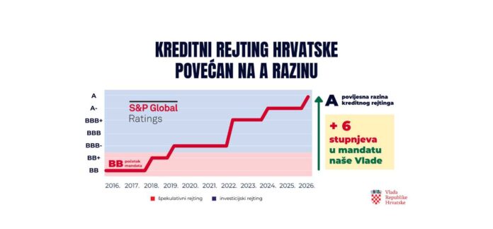 Međunarodna rejting agencija Standard & Poor’s podigla je kreditni rejting Hrvatske s razine A- na A, uz stabilne izglede. Time je Hrvatska dodatno učvrstila status države s visokom investicijskom razinom kreditne sposobnosti.