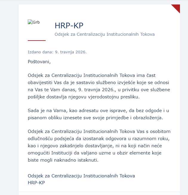Ako ste ovih dana primili e-mail u kojem se nepoznati pošiljatelj predstavlja kao HRP-KP – Odsjek za Centralizaciju Institucionalnih Tokova i traži od vas da dostavite primjedbe na neki „službeni izvještaj“, odmah ga obrišite. Ne odgovarajte, ne otvarajte priloge i ne klikajte na eventualne linkove.