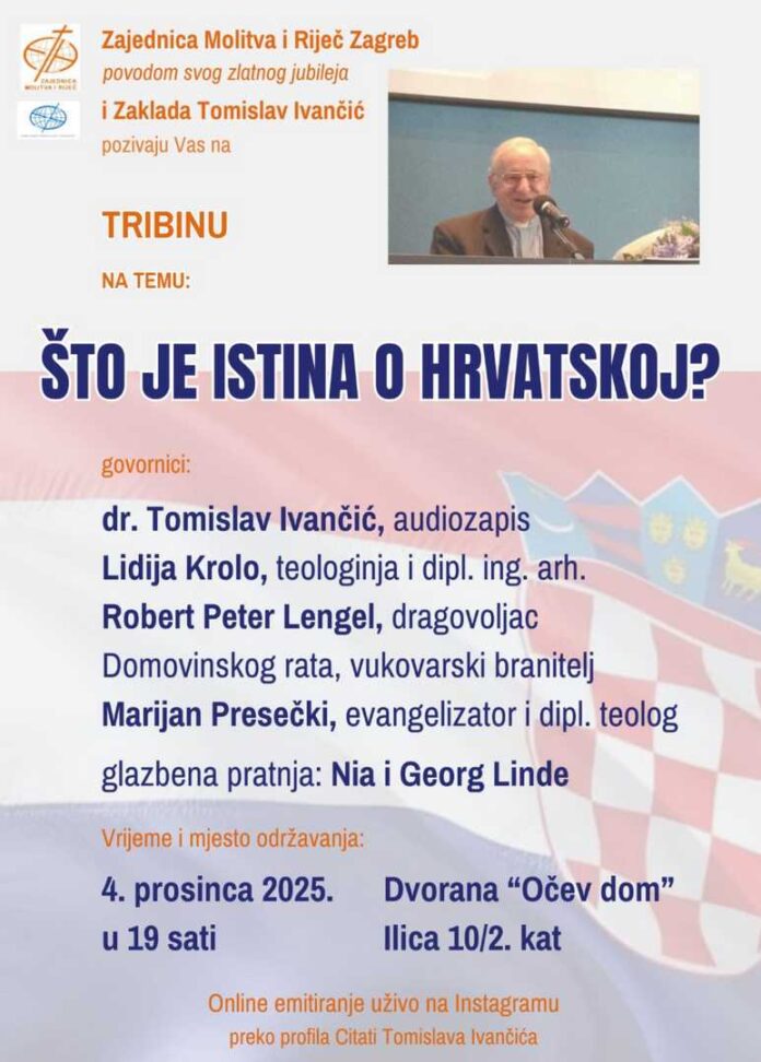Zagreb – Zajednica Molitva i Riječ Zagreb, povodom svog zlatnog jubileja, u suradnji sa Zakladom Tomislav Ivančić, poziva javnost na tribinu “Što je istina o Hrvatskoj?” koja će se održati 4. prosinca 2025. u 19 sati u dvorani “Očev dom”, Ilica 10, drugi kat.