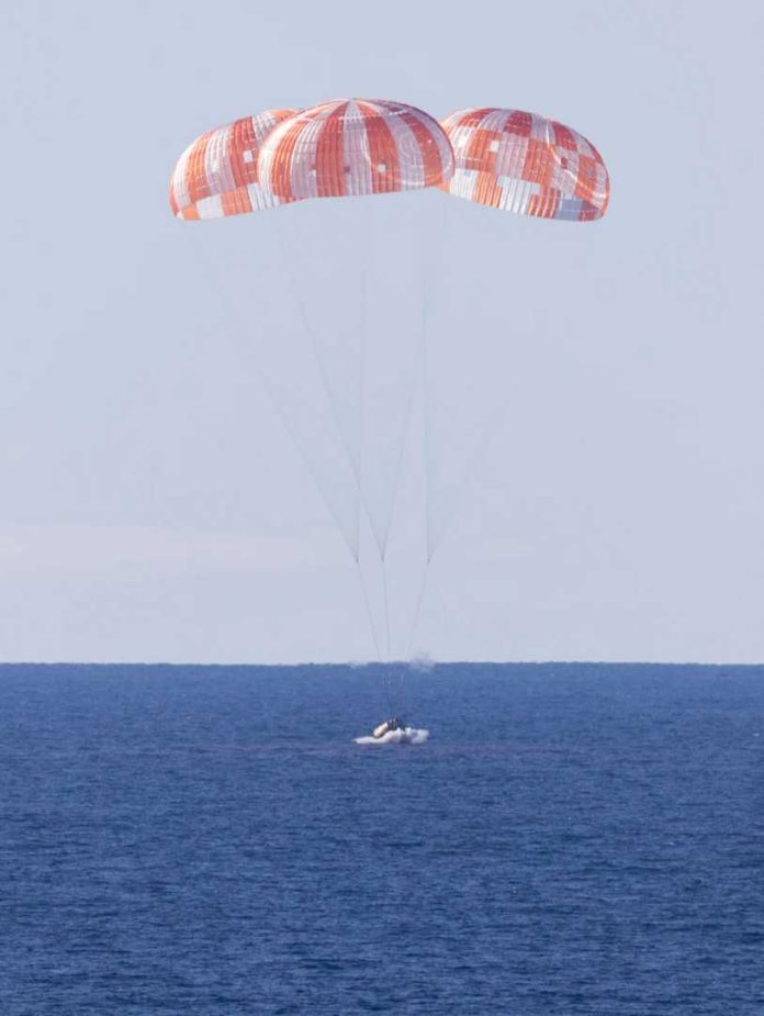 Povratak na Zemlju bio je tehnički jedan od najzahtjevnijih dijelova misije. Letjelica Orion ušla je u atmosferu velikom brzinom, a zatim je usporena složenim sustavom od 11 padobrana koji su je sigurno spustili u ocean, oko 100 kilometara od obale.