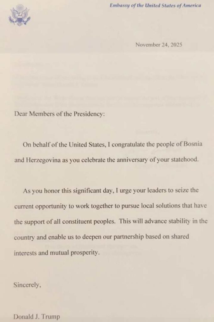 Predsjedništvo Bosne i Hercegovine primilo je čestitku iz Sjedinjenih Američkih Država povodom obilježavanja godišnjice državnosti. U poruci datiranoj na 24. studenoga 2025., američki predsjednik Donald J. Trump u ime Sjedinjenih Američkih Država čestitao je narodu Bosne i Hercegovine ovaj važan dan.