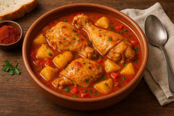 Priprema: Povrće narežite na komadiće, prelijte litrom vode i stavite kuhati. Meso posolite, utrljajte i ostavite da odstoji oko pola sata. Ugrijte ulje i meso pecite na naglo, okrećući oko 10 minuta. Dodajte približno 2,5 decilitra vode, a može i malo bijelog vina ili piva. Pirjajte meso okrećući oko narednih deset minuta, a zatim dodajte još 2 dl vode. Pustite da se lagano reducira. Povrće se skuhalo, a potom ga pasirajte, najbolje štapnim mikserom. Dodajte punu jušnu žlicu koncentrata rajčice, malu žličicu mješavine začina i još jednu mljevene crvene paprike. Dobro promiješan sadržaj prelijte preko mesa, po potrebi dodajte još malo vode. Dodajte papar, smanjite temperaturu i paprikaš ostavite da krčka 20-tak minuta na laganoj vatri povremeno okrećući meso. Pred kraj kuhanja skuhajte omiljenu tjesteninu. Kada procijedite tjesteninu nemojte je ispirati, a vodu sačuvajte ukoliko treba dodati u paprikaš koji je ukuhavao. Provjerite okus, a želite li da paprikaš bude pikantan prilikom pasiranja povrća dodajte malo ljute paprike. Prilikom pirjanja mesa možete dodati i šampinjone ili grašak, a tjesteninu zamijeniti noklicama.